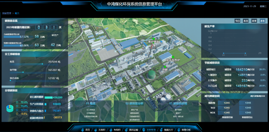 在中鴻集團(tuán)項(xiàng)目中,該系統(tǒng)通過(guò)3D地圖展示碳排放源,實(shí)時(shí)監(jiān)測(cè)各工序的碳排放量,優(yōu)化生產(chǎn)參數(shù),挖掘節(jié)能減排潛力,最終提升了能源利用效率。
