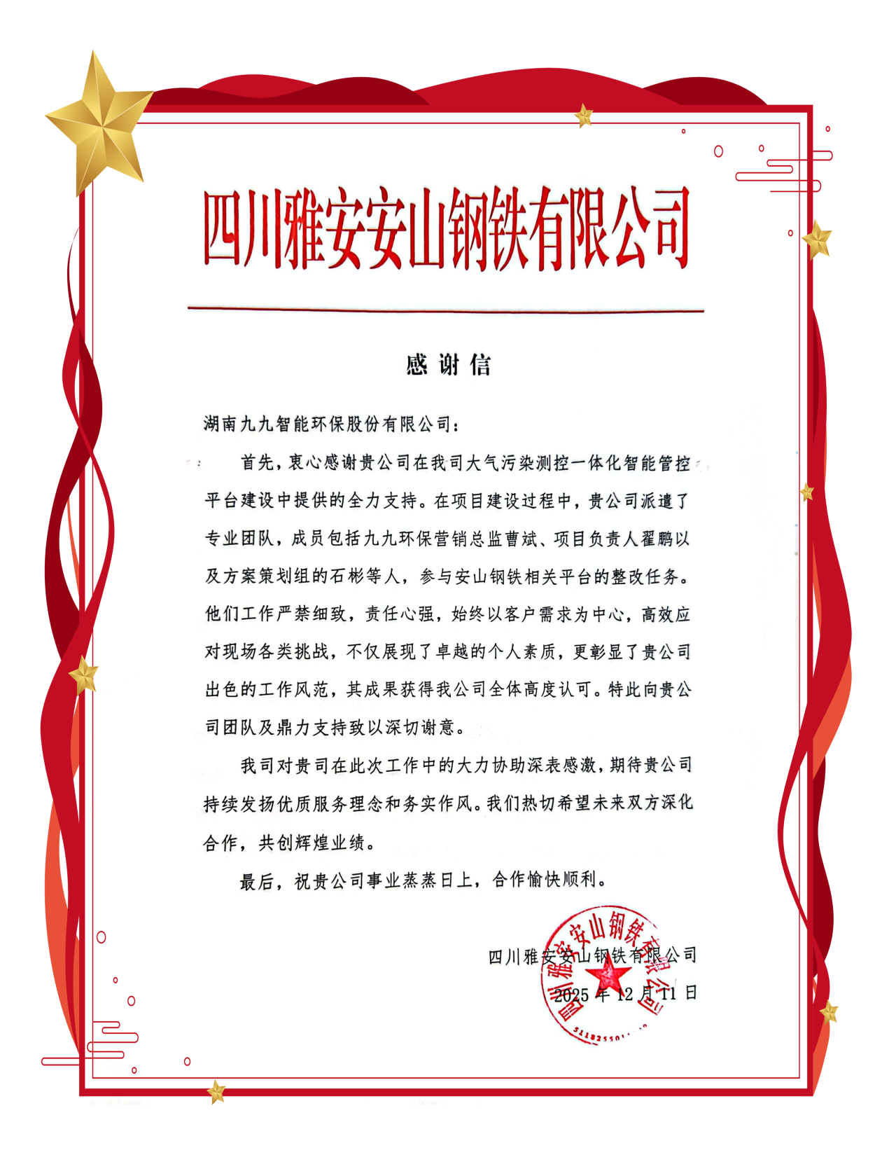12月11日,我們收到了來自合作伙伴四川雅安安山鋼鐵有限公司(以下簡(jiǎn)稱“安山鋼鐵”)的誠(chéng)摯感謝信。信中,安山鋼鐵對(duì)我司在“大氣污染測(cè)控一體化智能管控平臺(tái)”建設(shè)項(xiàng)目中提供的專業(yè)支持與卓越服務(wù)給予了高度評(píng)價(jià)與肯定。這不僅是一份榮譽(yù),更是對(duì)九九團(tuán)隊(duì)專業(yè)能力與服務(wù)精神的又一次生動(dòng)印證。