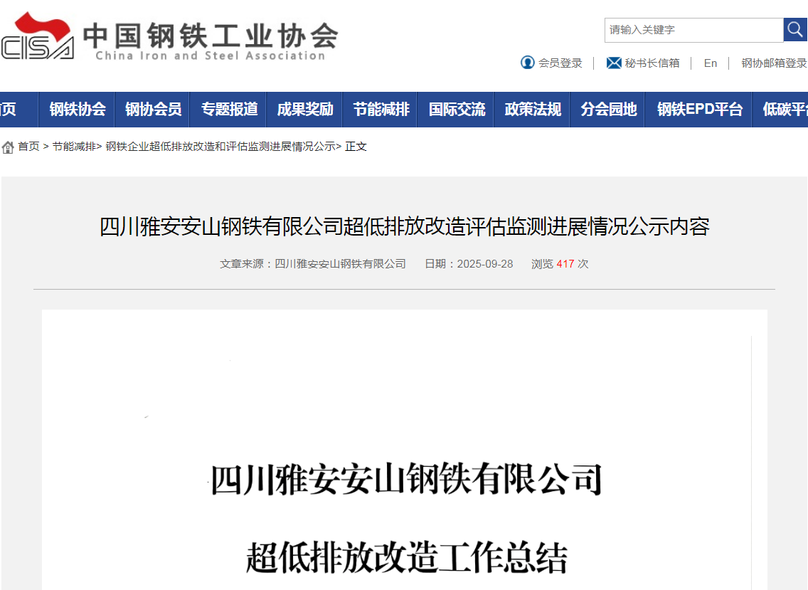 此前,安山鋼鐵超低排放改造評(píng)估監(jiān)測(cè)進(jìn)展情況已在中國(guó)鋼鐵工業(yè)協(xié)會(huì)官網(wǎng)掛網(wǎng)公示。